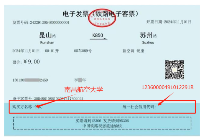 3、乘车人员在行程结束或者支付退票(改签)费用后180天内,登录本人铁路12306(包括网站和移动客户端)账户申请开具电子发票,购买方名称必须开具为南昌航空大学(统一社会信用代码:12360000491012291R),如果未开具,请自行红冲后重新开具,否则一律不予报销。乘车人员可通过铁路12306或个人所得税App查询、下载电子发票。具体开具流程见附件3。