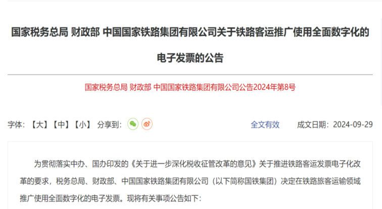 附件1.《国家税务总局 财政部 中国国家铁路集团有限公司关于铁路客运推广使用全面数字化的电子发票的公告》(2024年第8号)